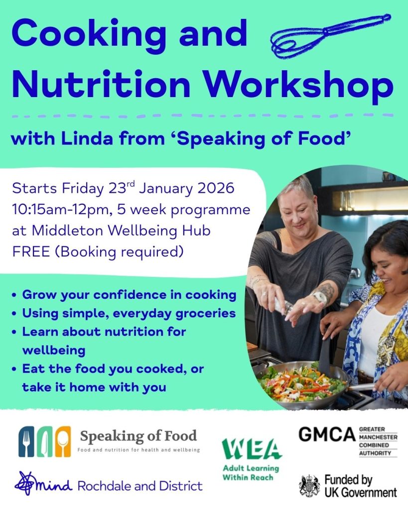 To view the current sessions taking place at Middleton Wellbeing Hub and across the Middleton area: including the Listening Lounge, Social Space, Sport4Wellbeing, and much more, please click the image below to download the timetable.